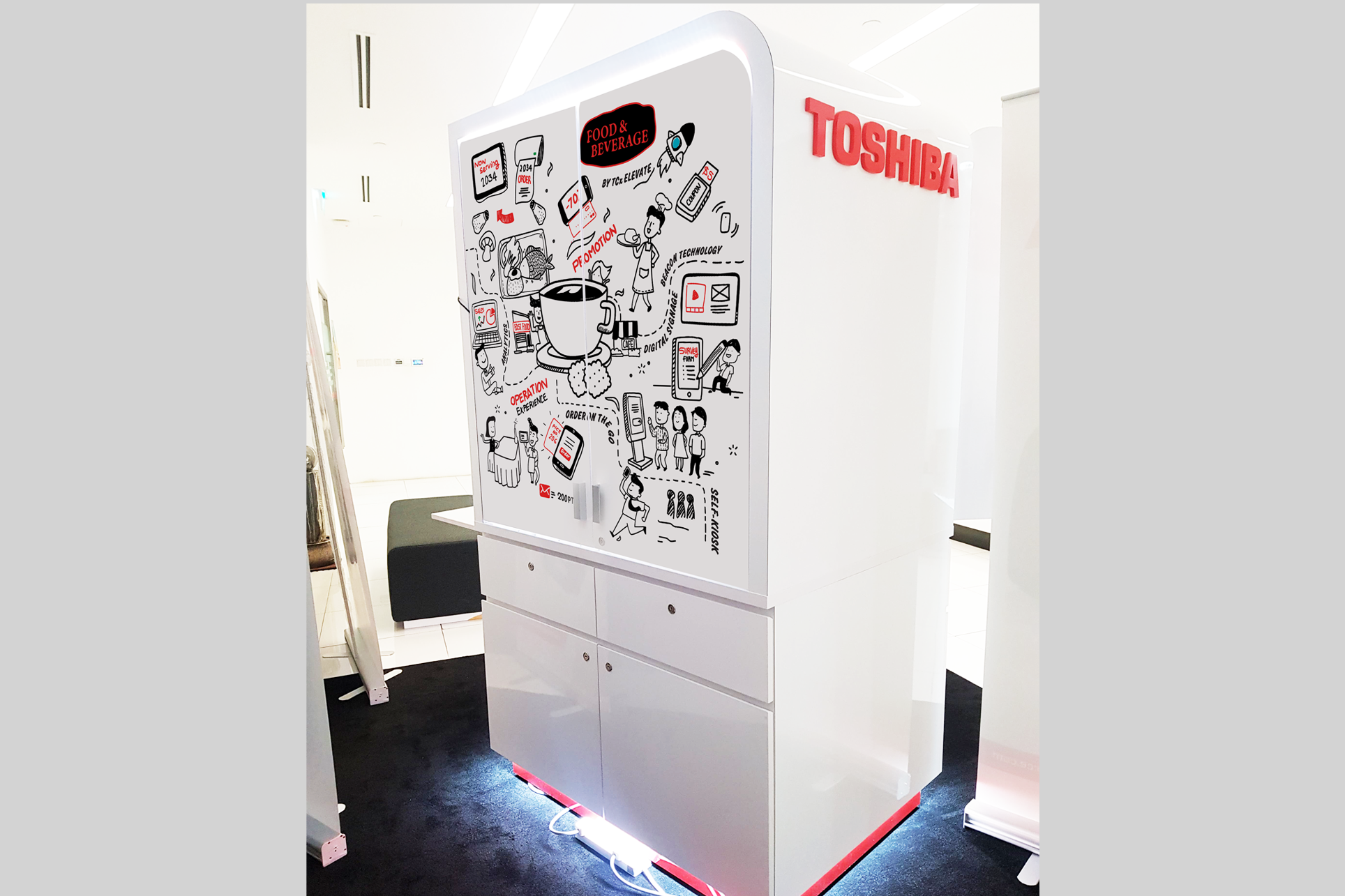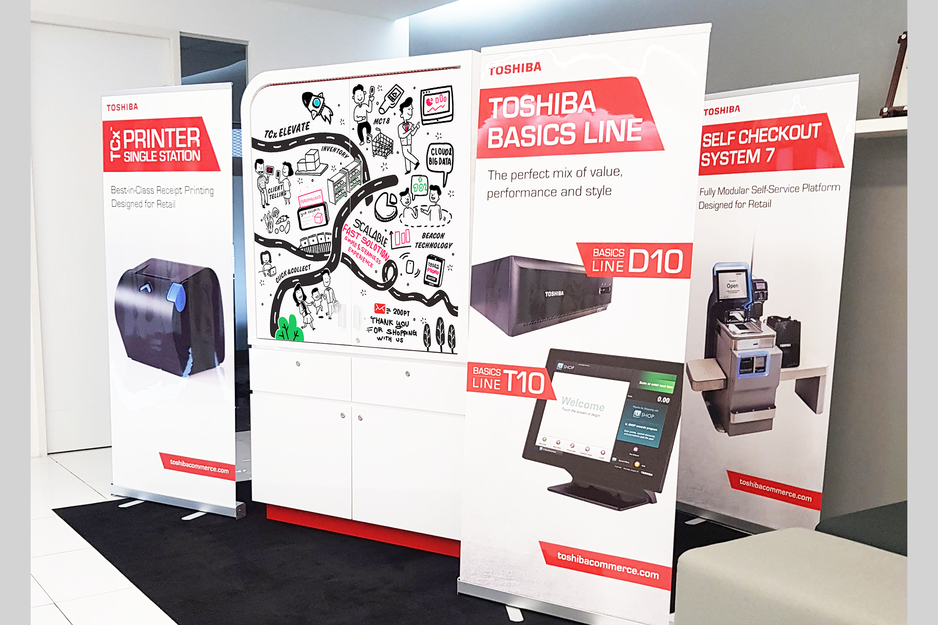 The main design principles are ease of movement, simplicity, cost-effectiveness, and the ability to display all Toshiba products. The pushcart includes the following features: 1. Zebra MC18PSS 2. POS machine 3. Receipt printer 4. Second display 5. Brochure slot 6. HDMI TV 7. Mobile tablet 8. HDMI TV for presentations and etc.