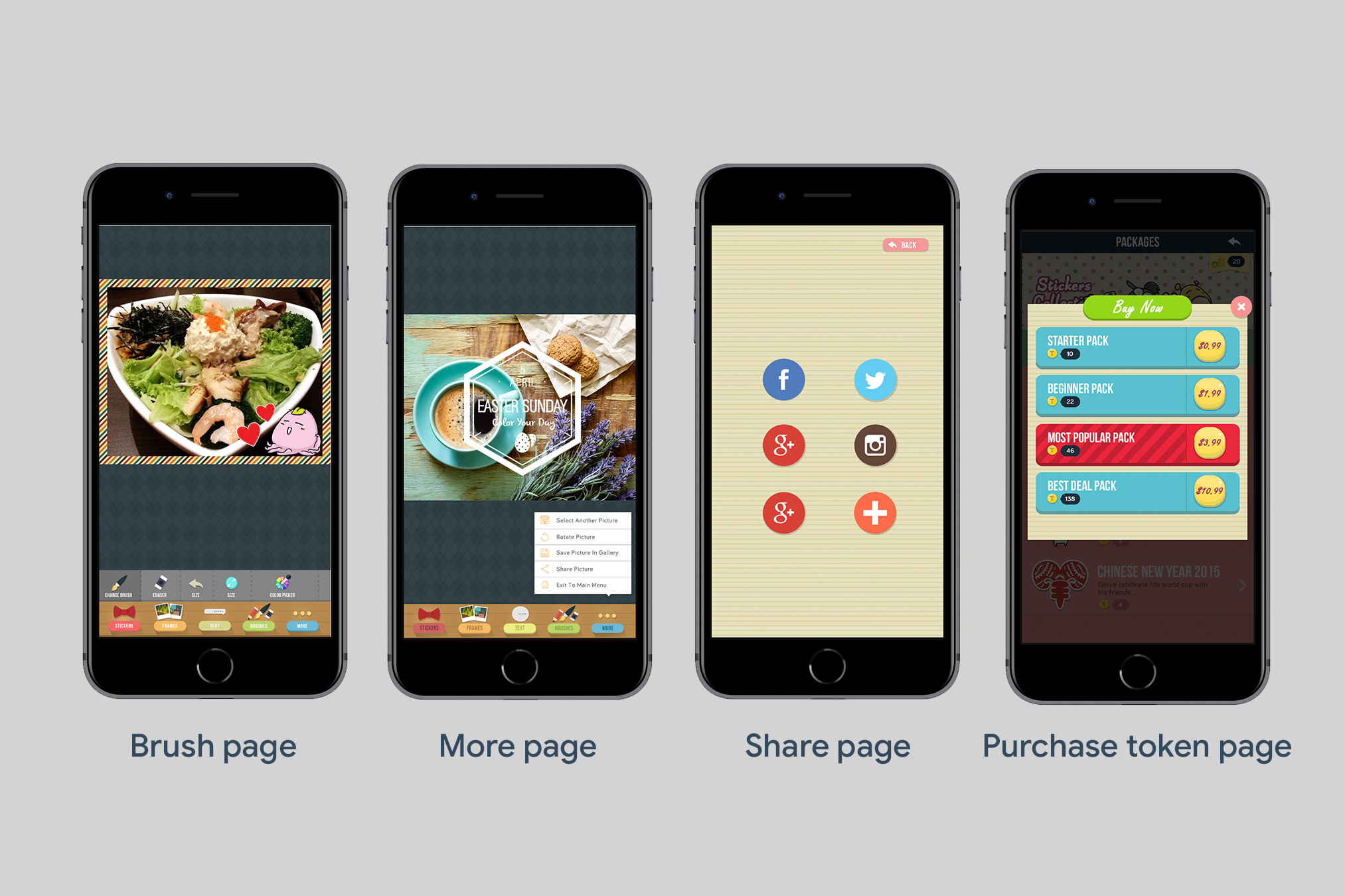 The app includes various themes and styles for stickers, including cute characters, ribbons, comic book graphics, and more. It also provides unique drawing effects and text styles to enhance photos for different occasions.