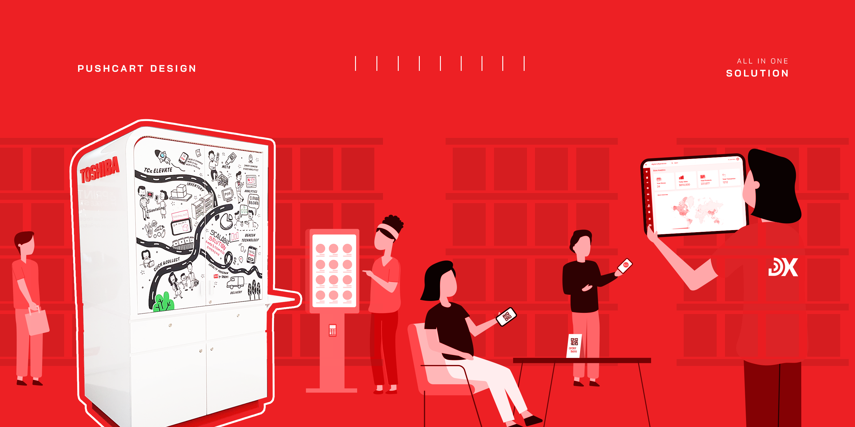 DX Demo Push Cart is designed to enhance shopping by creating a lively and interactive environment. Its main purpose is to help sales personnel effectively display Toshiba's products through a user-friendly, portable design that's easy to assemble and move. The cart showcases two key customer experiences: the Shopping Journey and the Dining Journey, highlighting how customers interact and the improvements in service. It features advanced options like mobility, loyalty programs, self-scanning, self-payment, self-checkout, and data analytics, along with CMS and CRM platforms, all aimed at providing a seamless and modern retail experience.