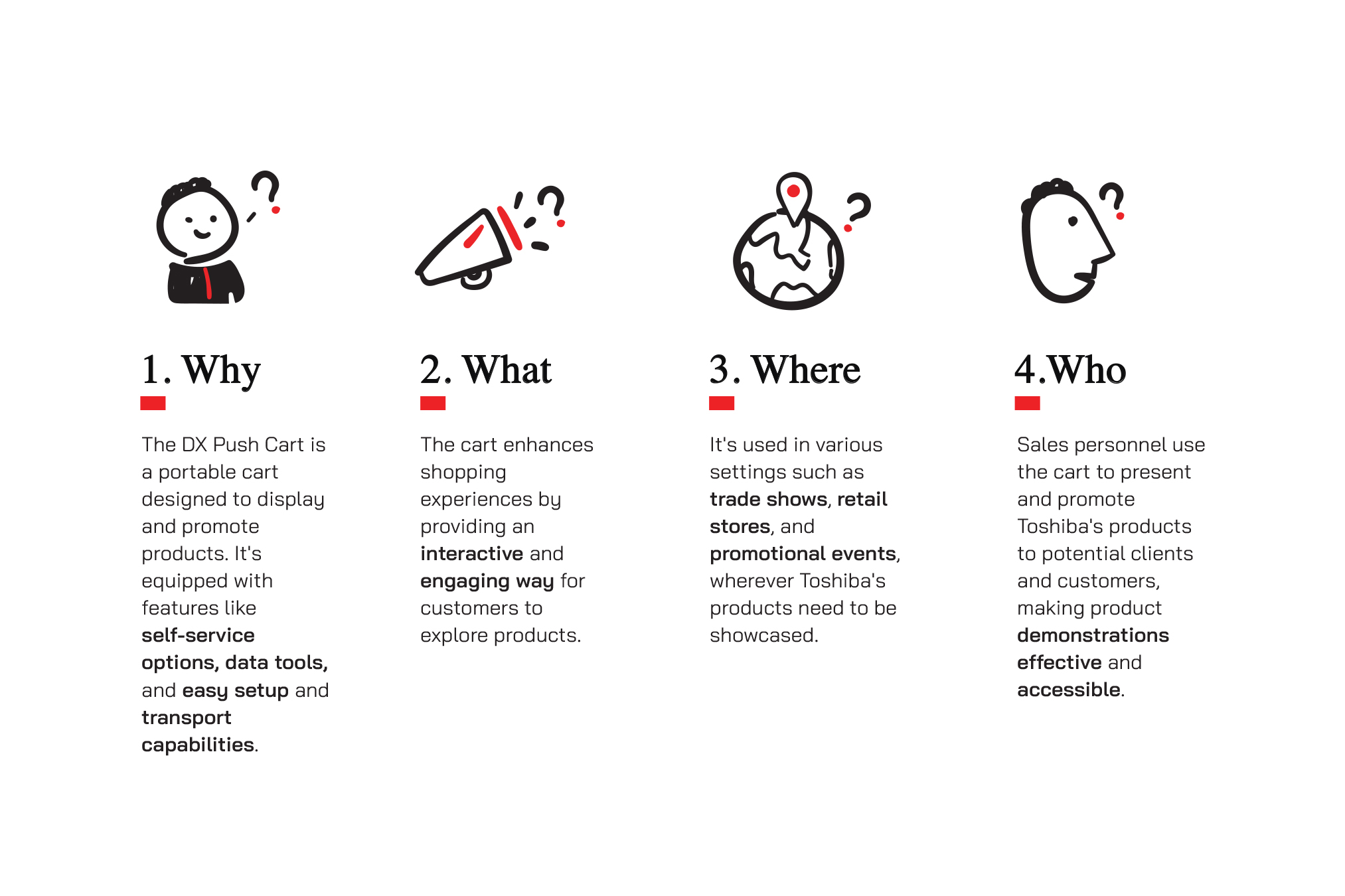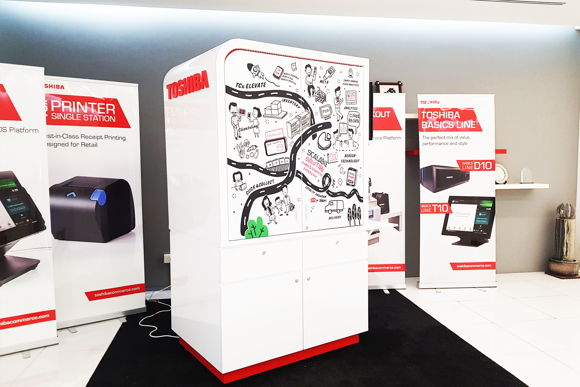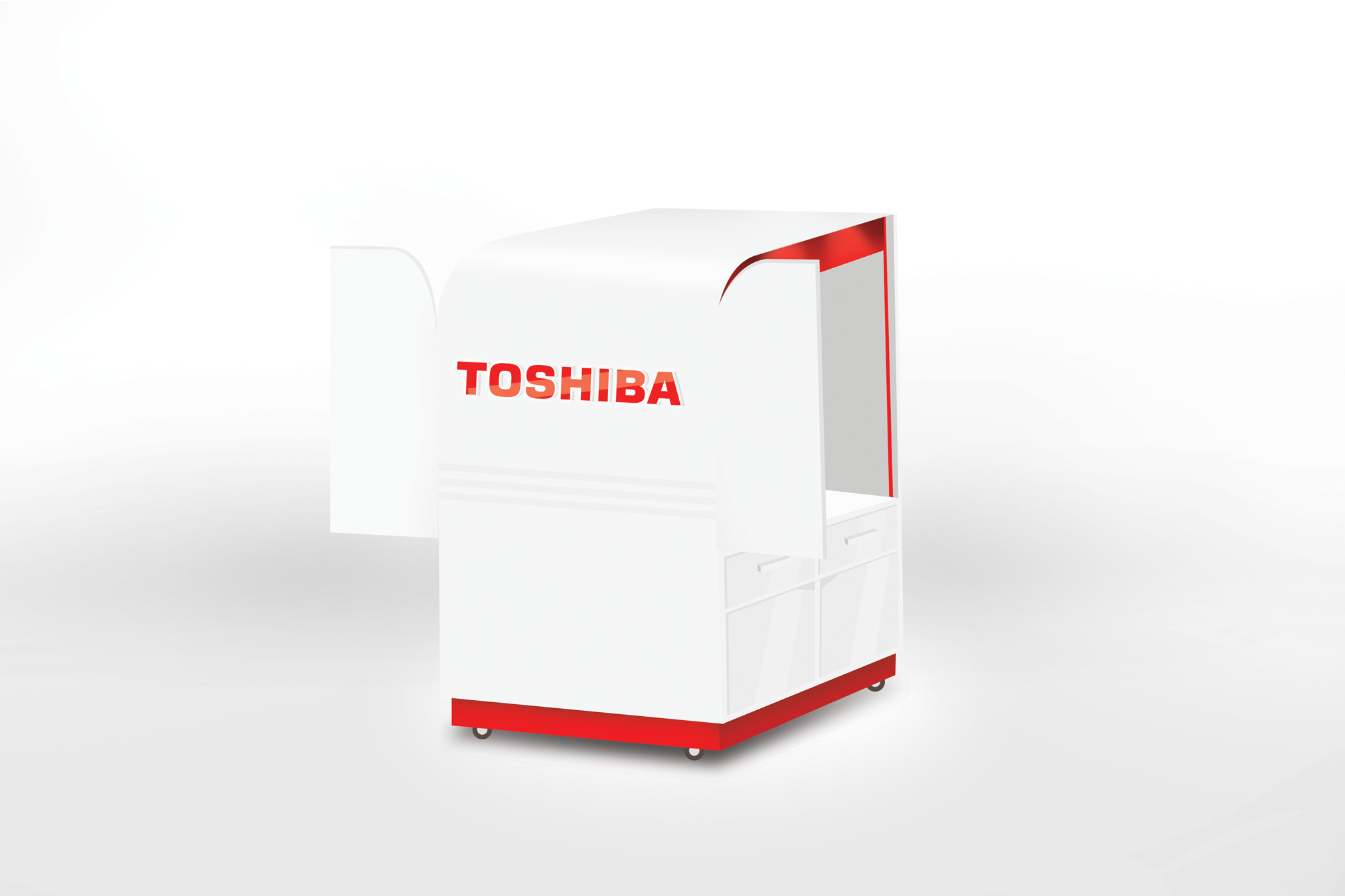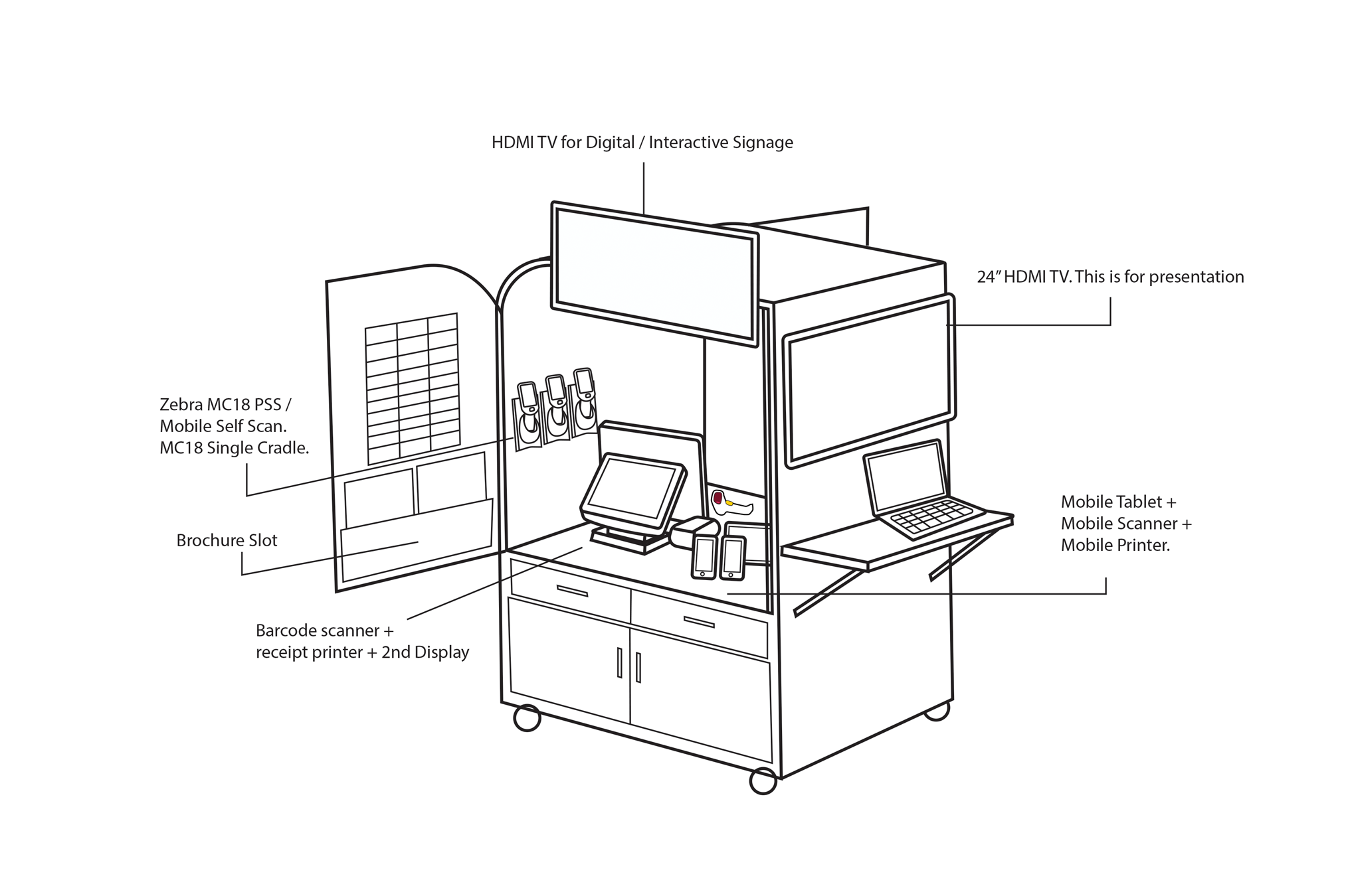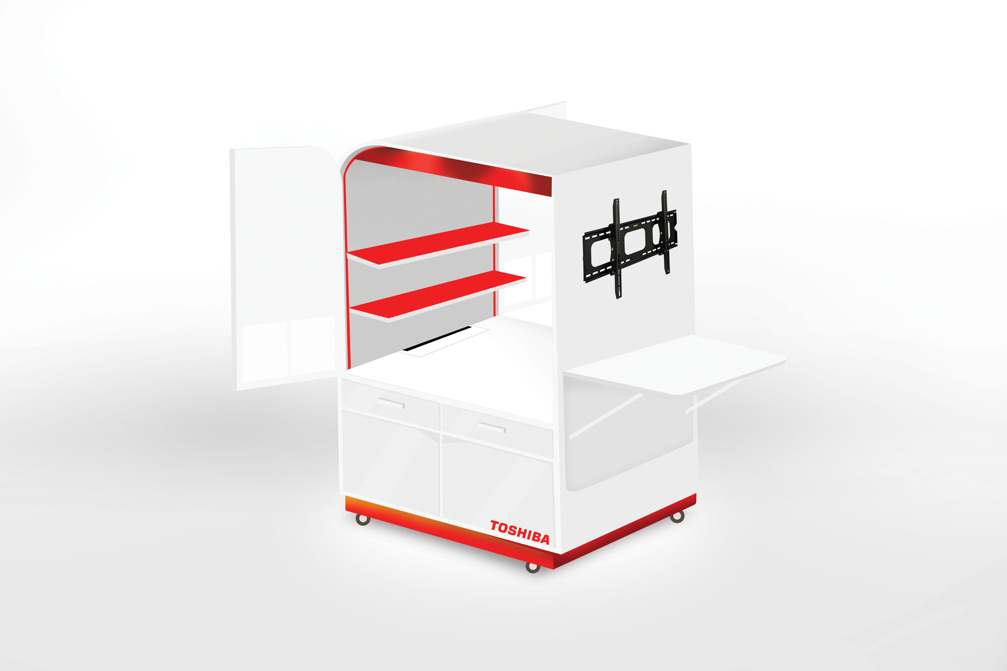 The main design principles are ease of movement, simplicity, cost-effectiveness, and the ability to display all Toshiba products. The pushcart includes the following features: 1. Zebra MC18PSS 2. POS machine 3. Receipt printer 4. Second display 5. Brochure slot 6. HDMI TV 7. Mobile tablet 8. HDMI TV for presentations and etc.