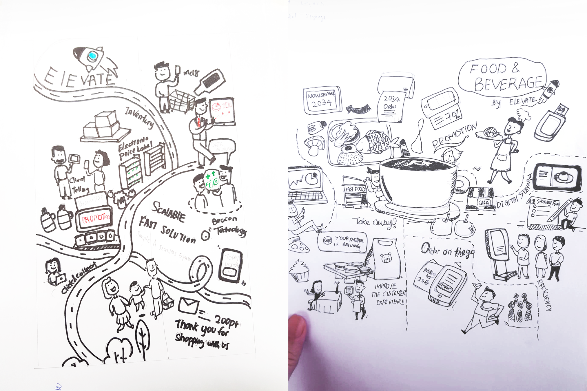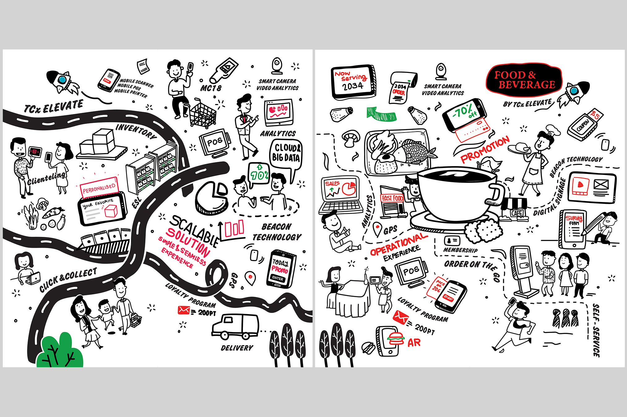 In order to convey a cheerful design and effectively illustrate all the features and product selling points, I have created a series of lively and cartoonish sketches. The designs incorporate elements such as promotions, smart technology, operational experiences, and customer engagement, inspired by the playful and vibrant style of vintage and modern pushcarts.